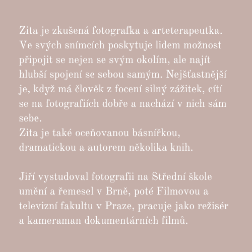 Nechceme však jen zdokumentovat život člověka a významné události. Usilujeme o to, aby naše fotografie a krátké filmy měli ducha, ve kterém se lidé sami poznají. Aby jednou, až si budou prohlížet staré fotografie, nebo sledovat filmové záběry cítili tu vůni jarního vzduchu, vybavila se jim chuť jídla z oblíbené restaurace, nebo dotek milované osoby.